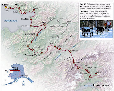 The world-famous Iditarod dog-sled race took off today from its traditional Anchorage, Alaska starting gate, bound for Nome. For two weeks, about 60 contestants drive their teams of 12-16 dogs across treacherous terrain covering over 1000 miles. The race is a commemoration of the the dog-sledders who saved the lives of residents of Nome in 1925, when a diphtheria outbreak required dog-sled teams to carry life-saving medicines to the stricken. The trail itself has been preserved as a National Historic trail.
